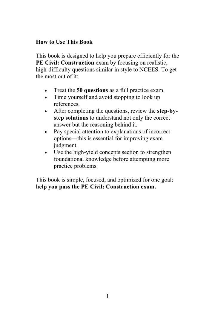 The ebook includes 50 advanced problems designed to feel exactly like real PE Civil: Construction questions — including traps, calculation steps, and reasoning patterns used in the actual exam.